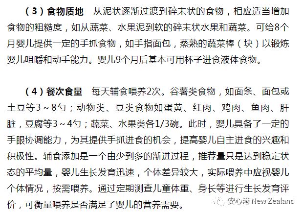 (2)辅食种类 初始阶段添加的辅食,应是容易吞咽和消化,不容易导致过敏的食物。强化铁的谷类食物,如强化铁的米粉等;蔬菜类如白萝卜、胡萝卜、南瓜、西红柿、菠菜泥等均是常见的选择;水果类常见的有苹果、香蕉、梨子、木瓜泥等。从婴儿6个月开始,推荐应用辅食营养补充品(营养包)。