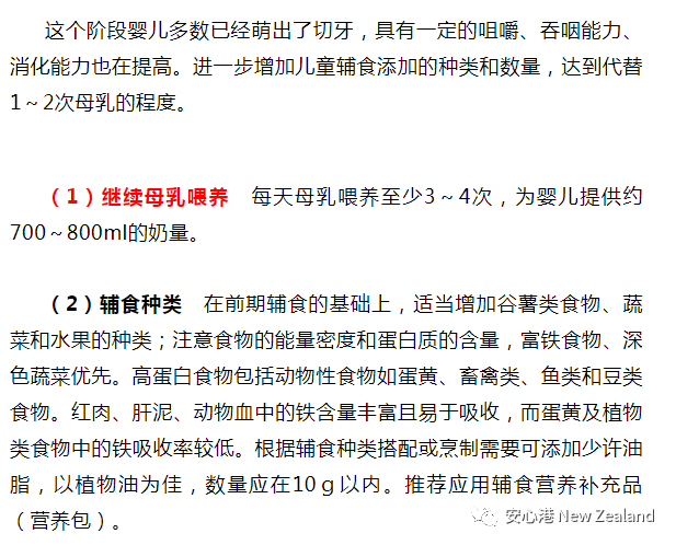 (1)继续母乳喂养 强调母乳喂养的重要性,母乳充足者不要用婴儿配方奶替代母乳。每天为婴儿提供约800~1 000mL的奶量。