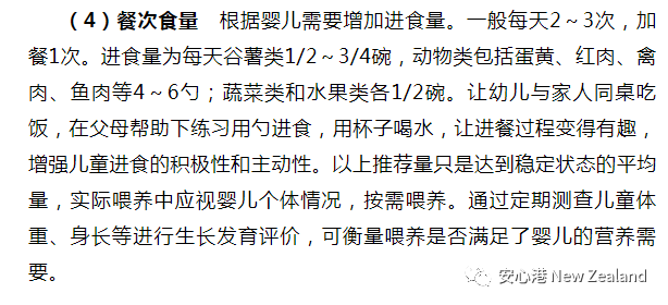 (4)餐次食量 开始1天1次,每次1~2勺米粉或蔬菜、水果泥。每次只添加一种,注意观察婴儿添加辅食后的反应。观察5~7天无不良反应后再添加另一种辅食。随时间推移,逐渐增加到1天2~3小餐。